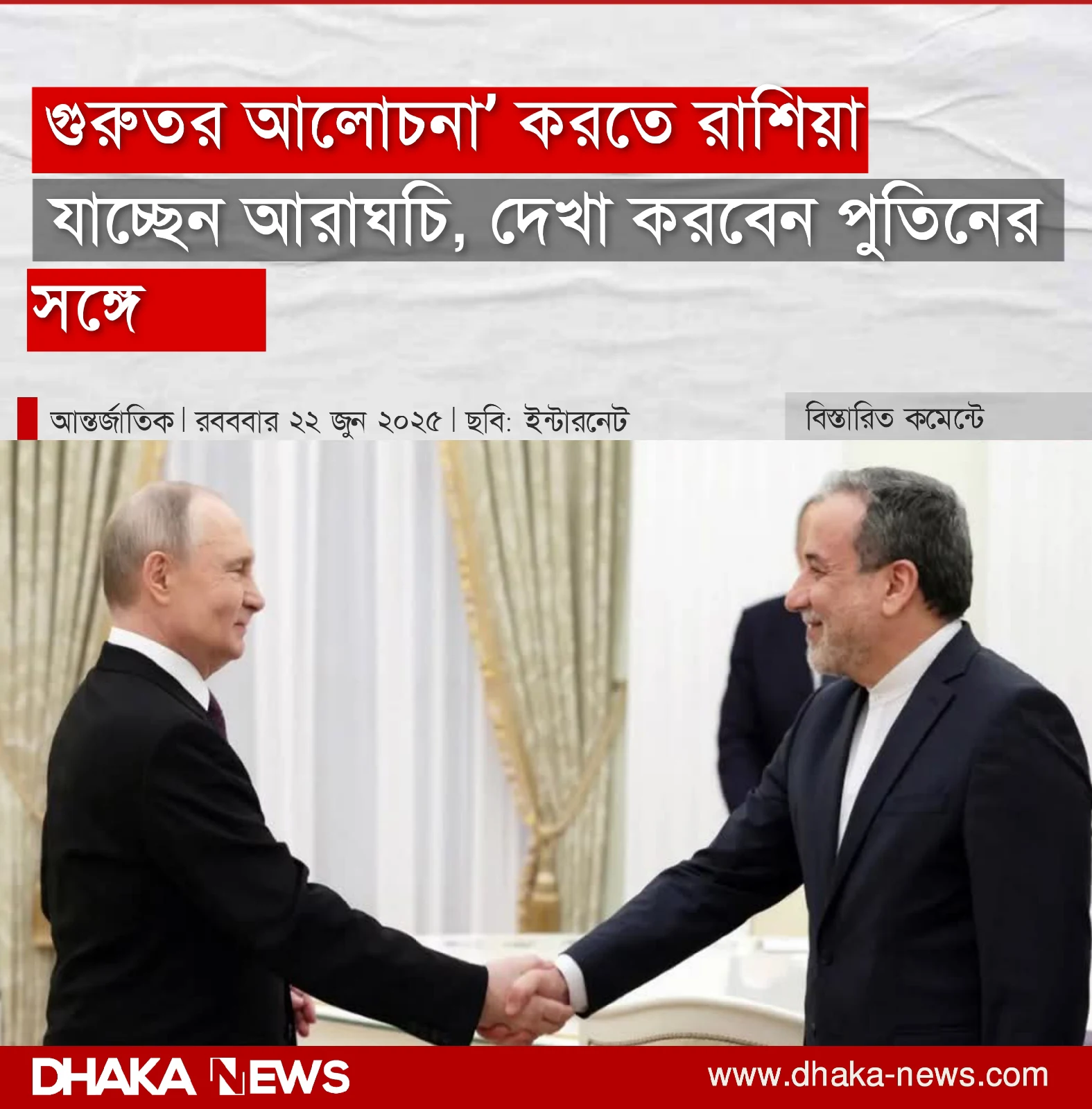 আরাঘচি বলেন, আগামীকাল রাশিয়ায় তিনি ‘গুরুতর আলোচনা’ করবেন। রাশিয়ার প্রেসিডেন্টের সঙ্গে বৈঠক করা তার সফরের পরিকল্পনার মধ্যে রয়েছে। এর আগে আজ ভোরে ইরানের ওপর বি-২ স্পিরিট বিমান থেকে ভারী বোমা হামলার পর মার্কিন প্রেসিডেন্ট ডোনাল্ড ট্রাম্প ঘোষণা করেন, যুক্তরাষ্ট্রের বিমান বাহিনী ইরানের তিনটি পারমাণবিক স্থাপনায় সফল আক্রমণ চালিয়েছে।